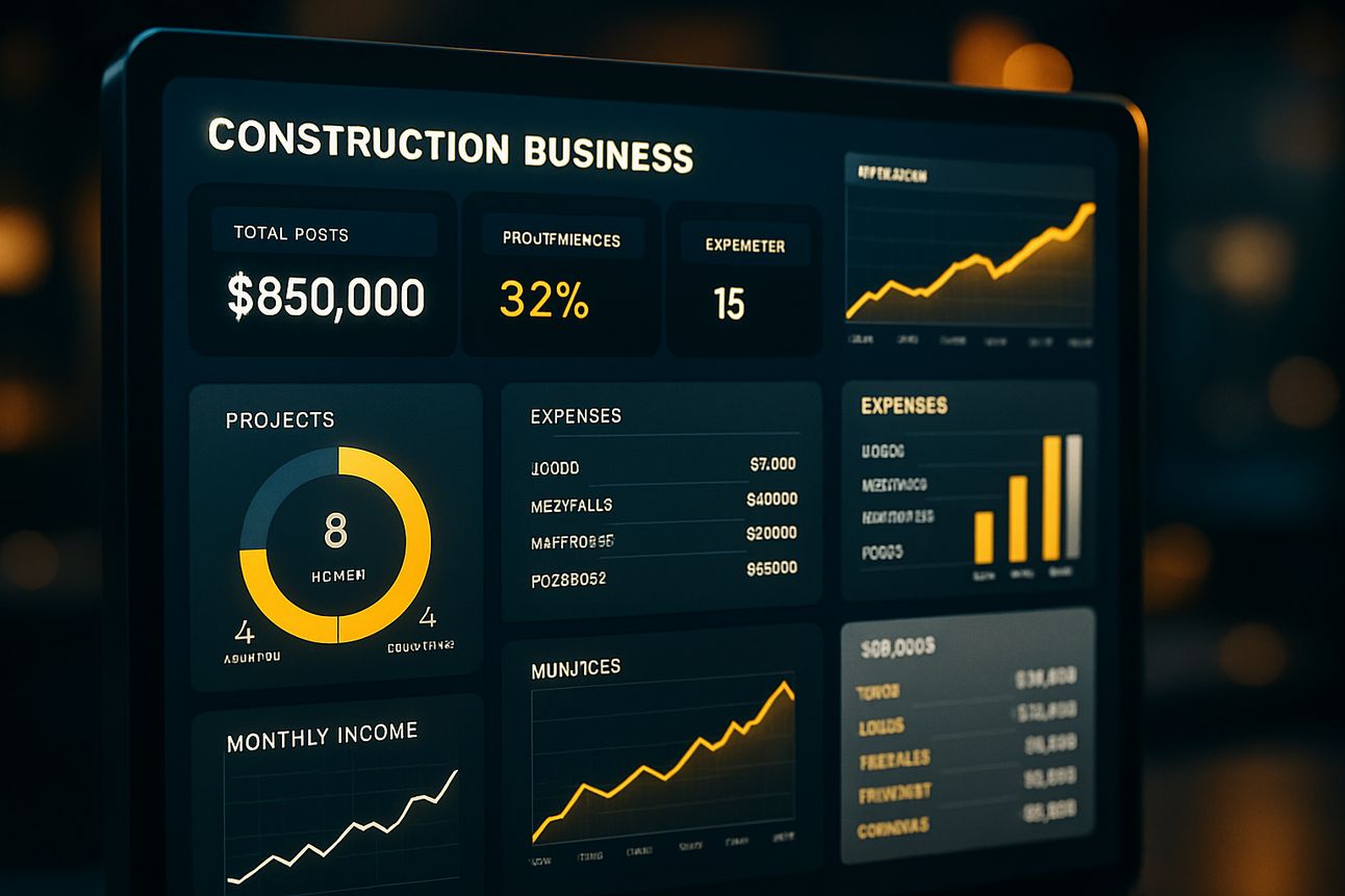 An illustrated dashboard displaying a comprehensive set of financial metrics and data inputs for a construction business, presented in a sleek, high-tech visual style.