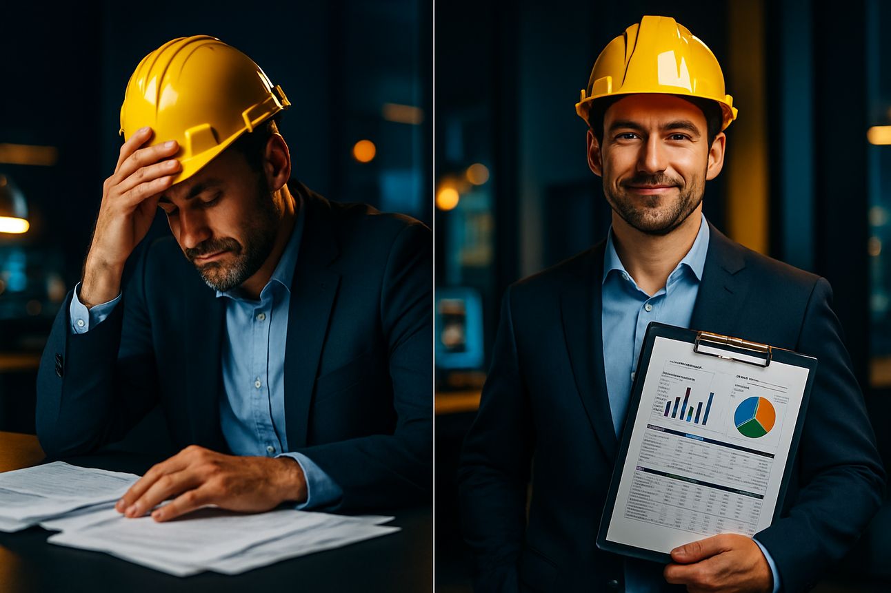 construction business owner transitioning from stressed with paperwork to confident with organized financial documents, split image showing before and after, professional setting