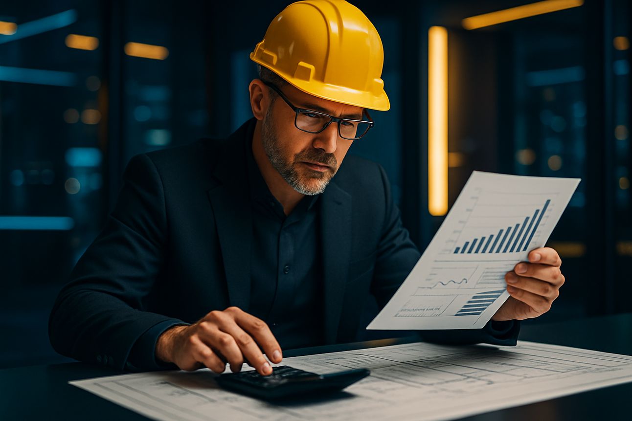A construction business owner reviewing financial documents with a calculator and blueprints in a professional, high-tech setting with warm lighting, focused on financial growth and profitability.