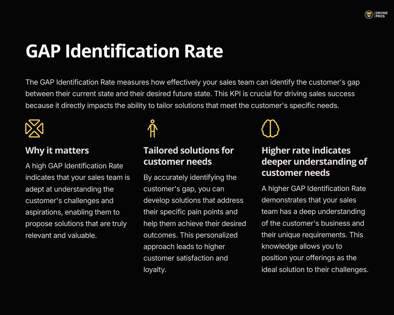 This KPI measures how effectively your sales team identifies the gap between the customer's Current State and Future State. A higher rate indicates a deeper understanding of customer needs.