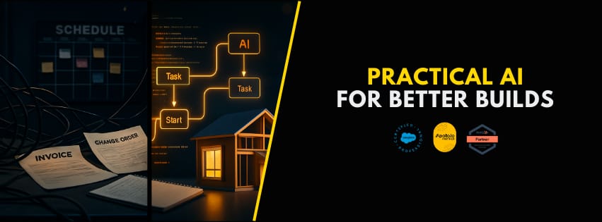 Practical AI for Better Builds, the image is a visual representation of various concepts, including scheduling, business transactions, and automation.