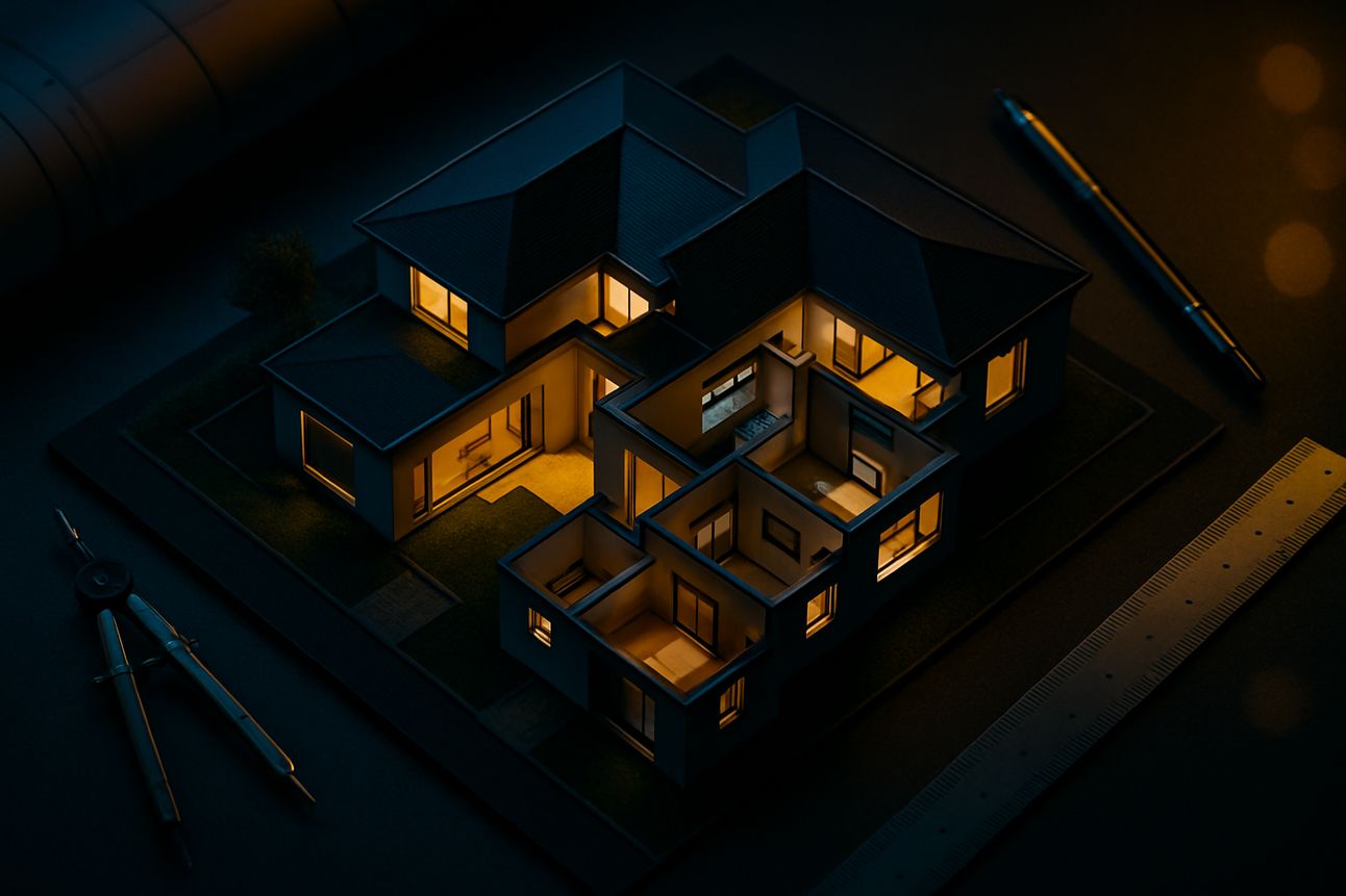 A highly detailed, realistic top-down mockup of a custom home