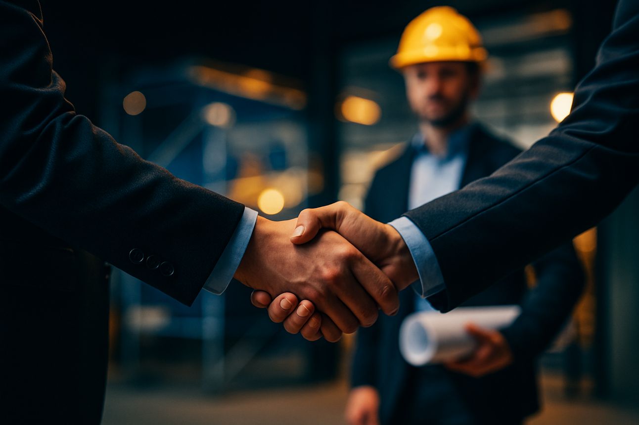 a handshake between two business professionals, symbolizing partnership and agreement, with a blurred background of a successful project