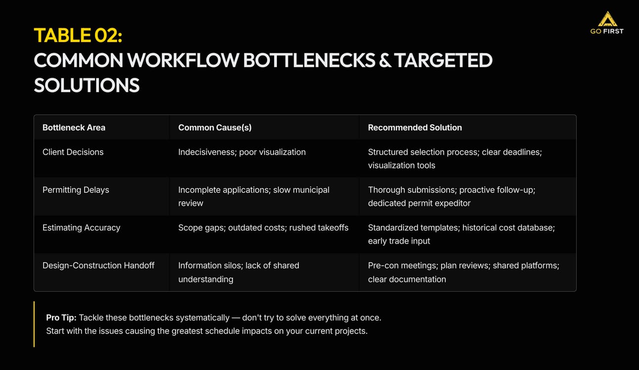 Systemize Handoffs: Friction between sales, production, and trades costs you time and money. Systematize these transitions to maintain momentum.